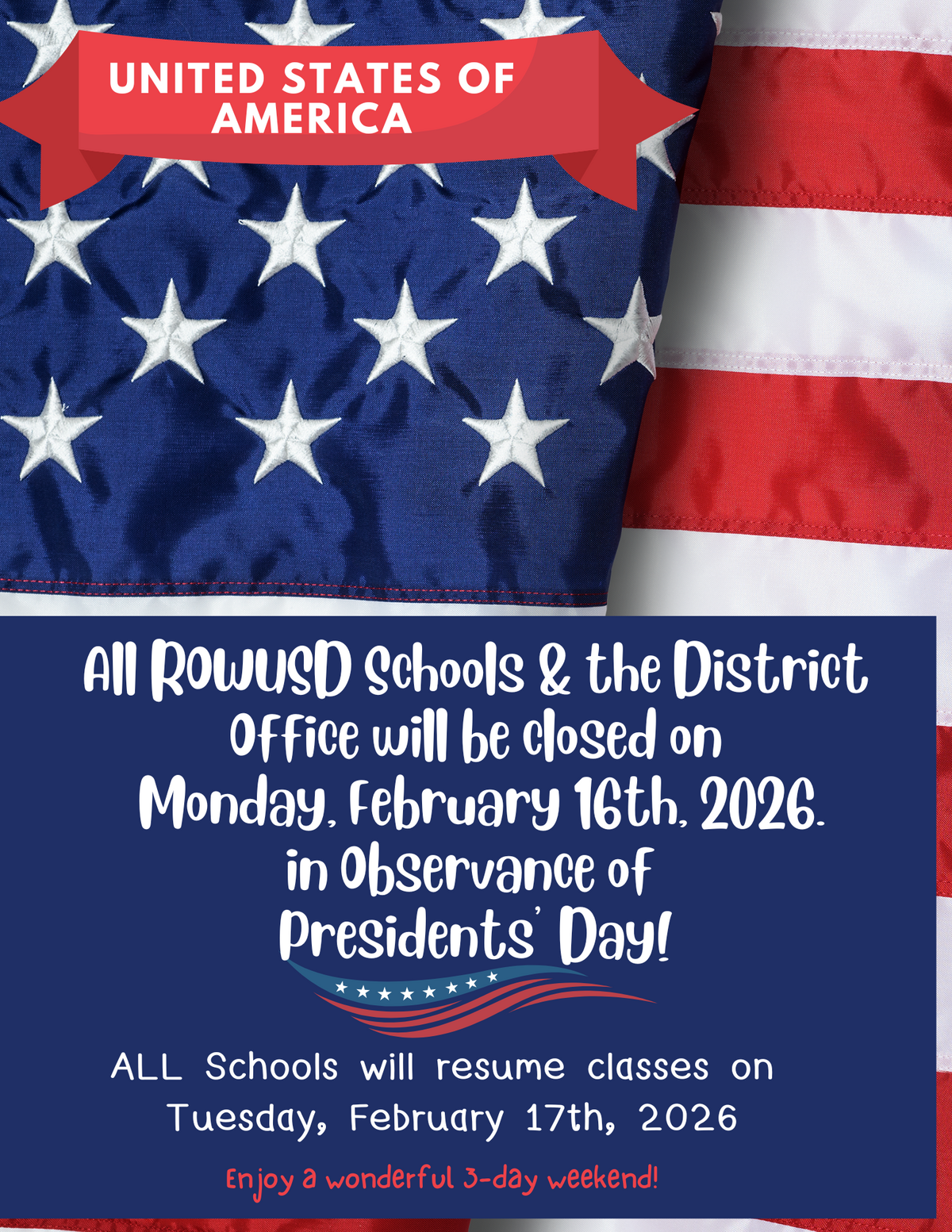 🚨REMINDER🚨 Monday, February 16th, all schools and offices will be closed in observance of the 🇺🇸 Presidents' Day Holiday 🔴⚪️🔵!