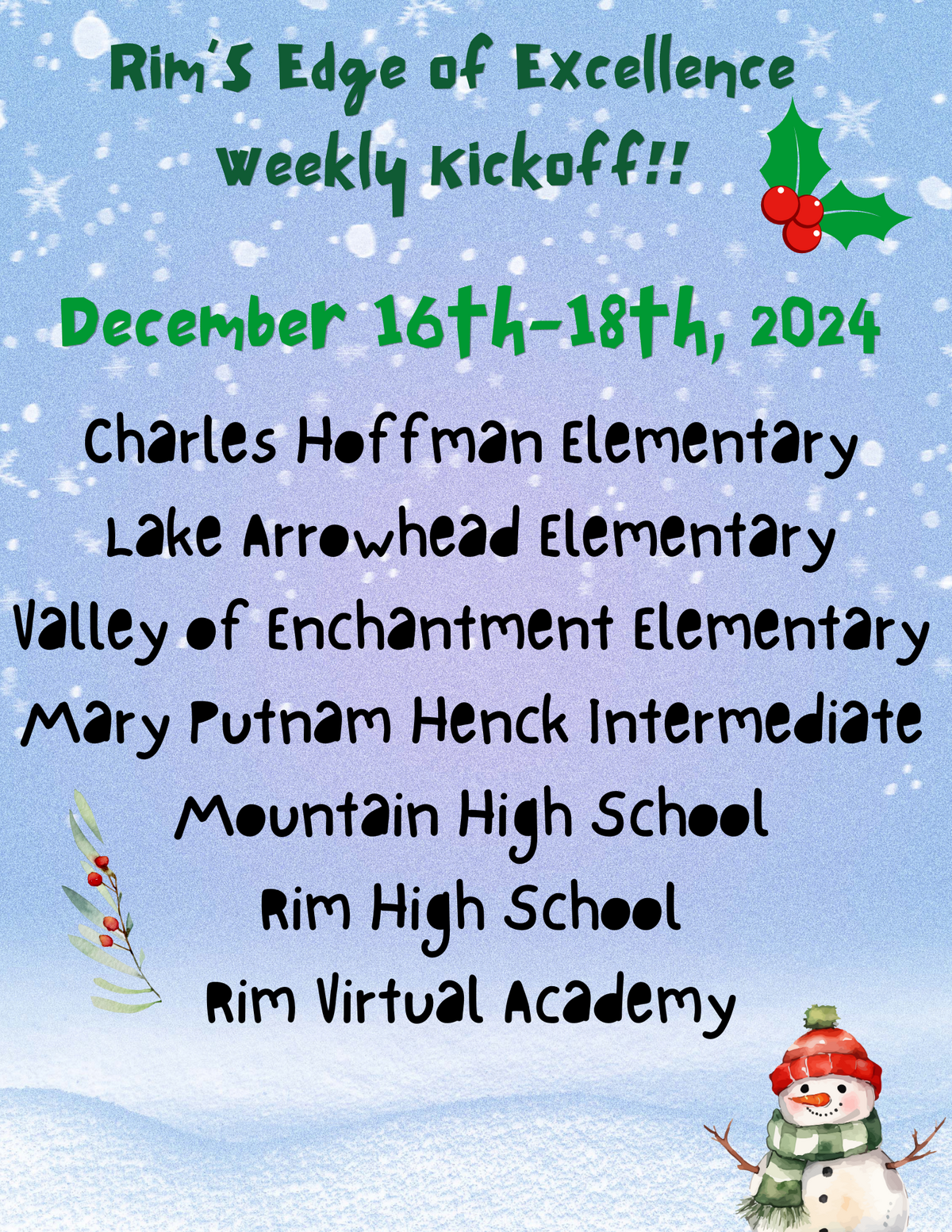 Page One: Rim’s Edge of Excellence Weekly Kickoff!! December 16th-18th, 2024-Charles Hoffman Elementary Lake Arrowhead Elementary Valley of Enchantment Elementary Mary Putnam Henck Intermediate Mountain High School Rim High School Rim Virtual Academy