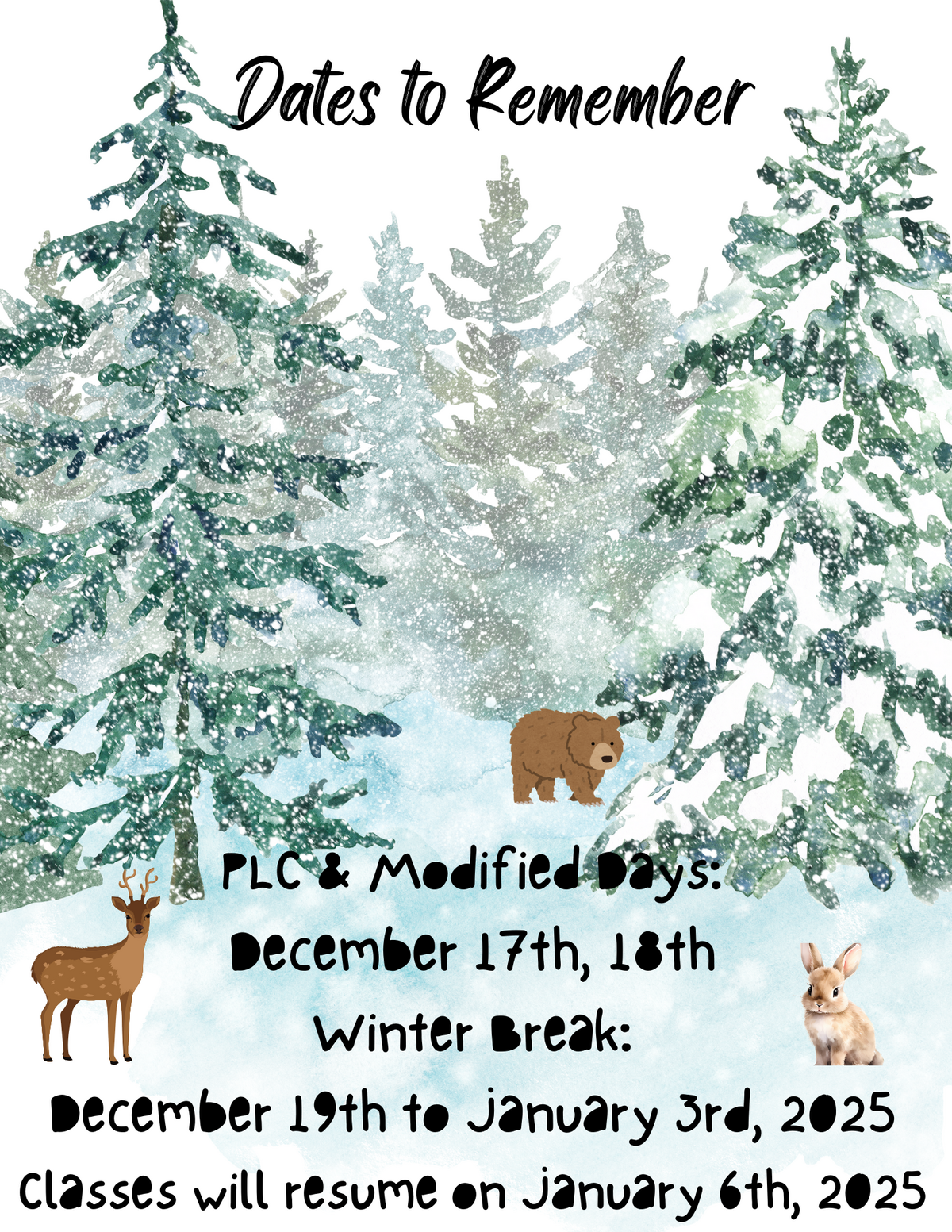 Page Two:Â Dates to Remember-PLC & Modified Days: December 17th, 18th Winter Break: December 19th to January 3rd, 2025 Classes will resume on January 6th, 2025