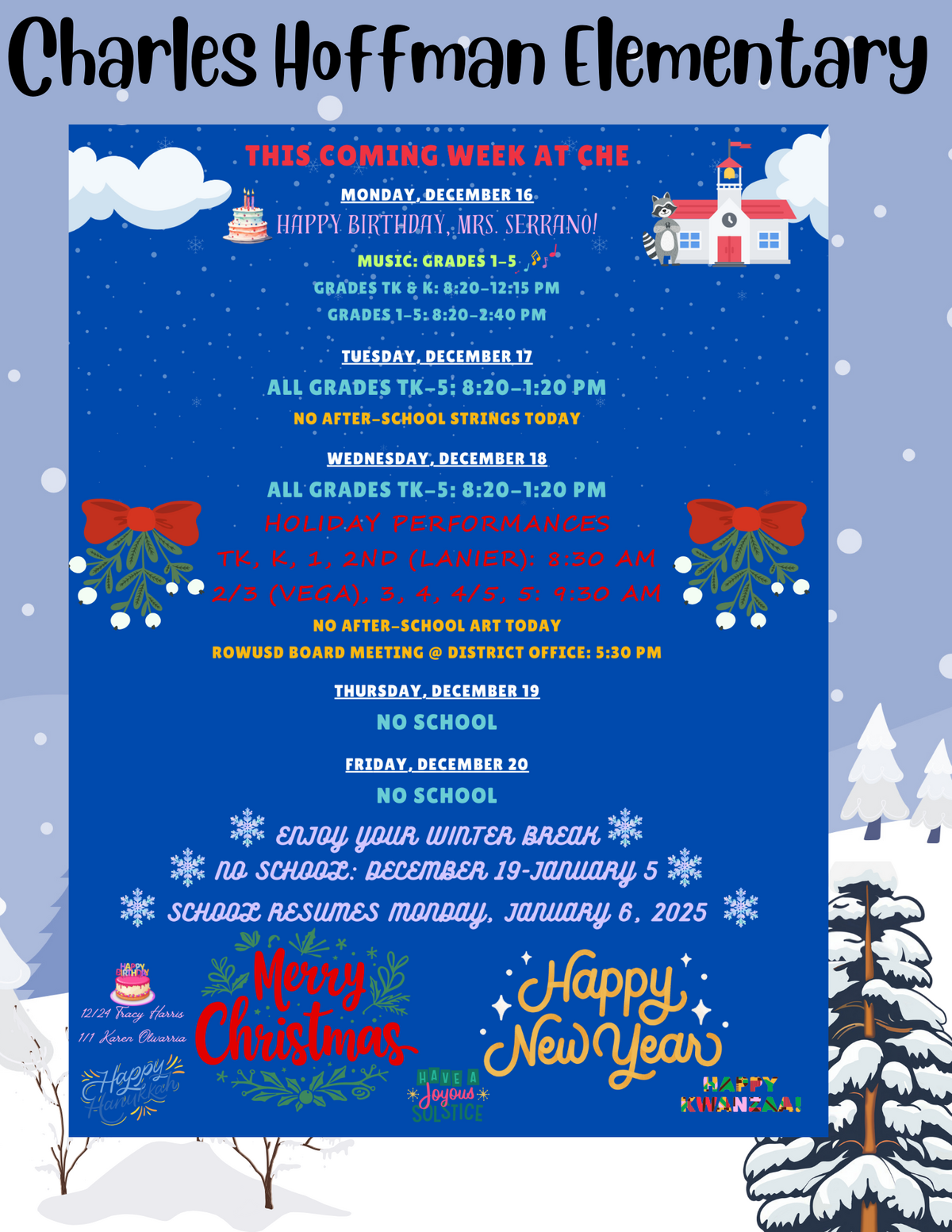 Page Three: CHE. This coming week: Happy Birthday Mrs. Serrano. Music Grades 1-5; Grades TK-K: 8:20 am to 12:15 pm. Grades 1-5: 8:20 am to 2:40 pm. Tuesday-Dec .17th: All Grades TK-5th: 8:20 am to 1:20 pm. No after school strings today. Wednesday 12/18: All Grades TK-5th: 8:20 am to 1:20 pm. Holiday Performances: TK, K, 1, 2nd(Lanier): 8:30am; 2/3 (Vega), 3,4,4/5,5,9:30 am. No after-School Art Today. ROWUSD Board Meeting @ District Office: 5:30 pm./ Thursday, December 19th No school. Friday-December 20th. No School. Enjoy your winter break. No school December 19th-January 5th. School resumes Monday, January 6th, 2025.Â