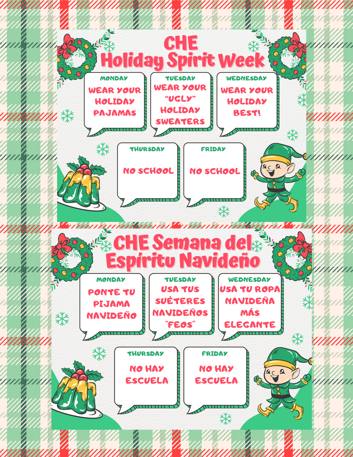 Page Four,: CHE Holiday Spirit Week: Monday: Wear your holiday pajamas; Tuesday-Wear your 'UGLY' Holiday Sweaters; Wednesday, Wear your holiday Best!; Thursday & Friday-No School. Â Â
