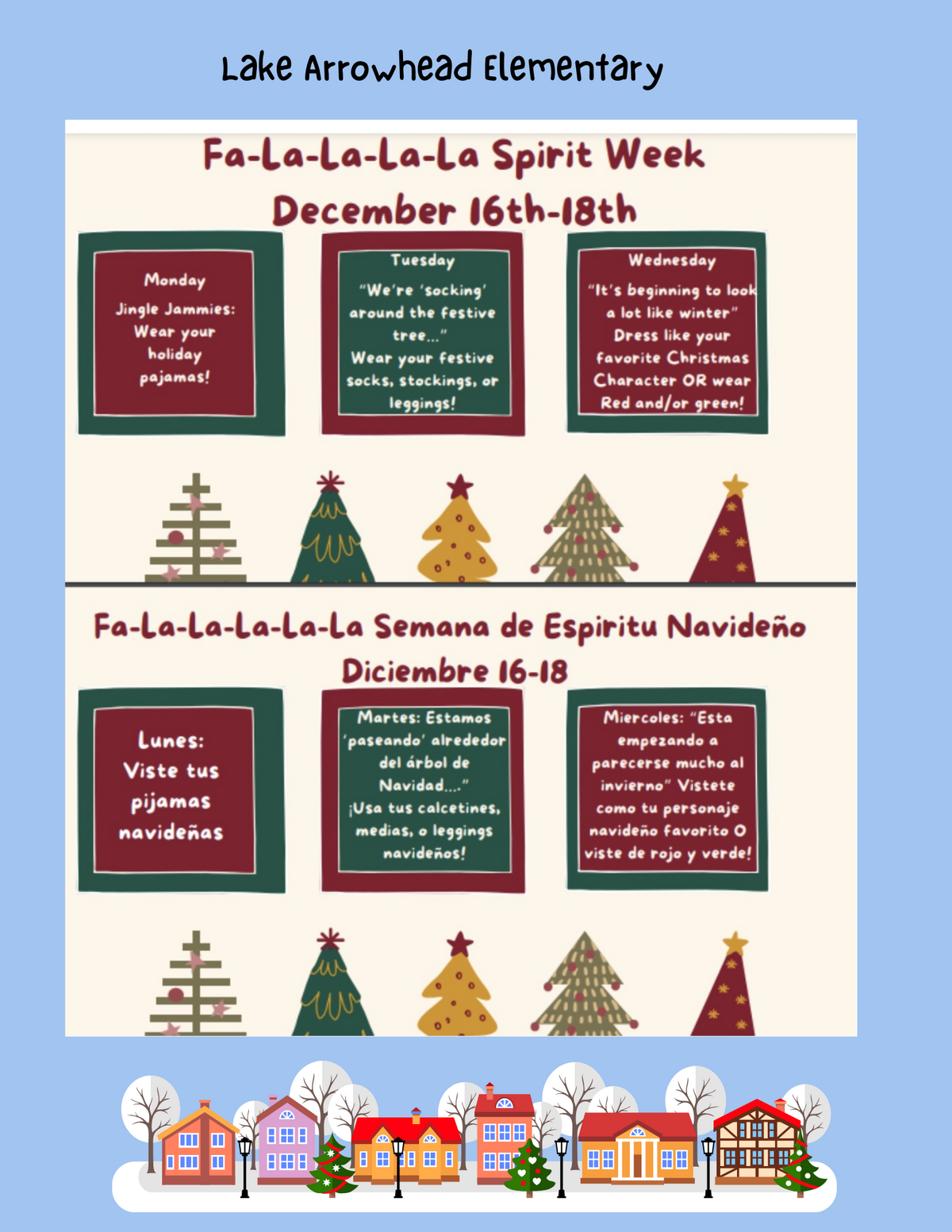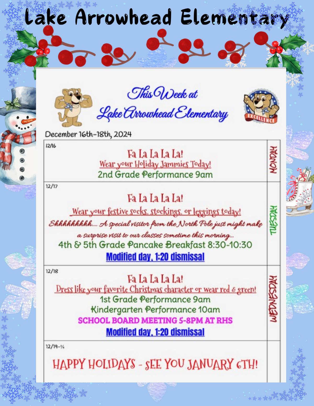 Page Eight & Nine: Lake Arrowhead Elementary: Fa La La La! Wear your holiday jammies. 2nd grade Performance 9 am.; 12/17: Wear your festive socks, stockings, or leggings today-Tuesday. SHHHH!!!A special visitor from the North Pole just might make a surprise visit to our classes sometime this morning. ; 4th & 5th grade pancake breakfast 8:30 am to 10:30 am. Modified Day-early dismissal at 1L20 pm. Â December 18th: Dress like your favorite Christmas character or wear red & green. ; 1st grade Performance at 9 am.; Kindergarten performance at 10 am. School Board Meeting 5 pm to 8 pm at RHS. Modified day: Dismissed at 1:20 pm. Â Happy Holidays-See you January 6th.Â