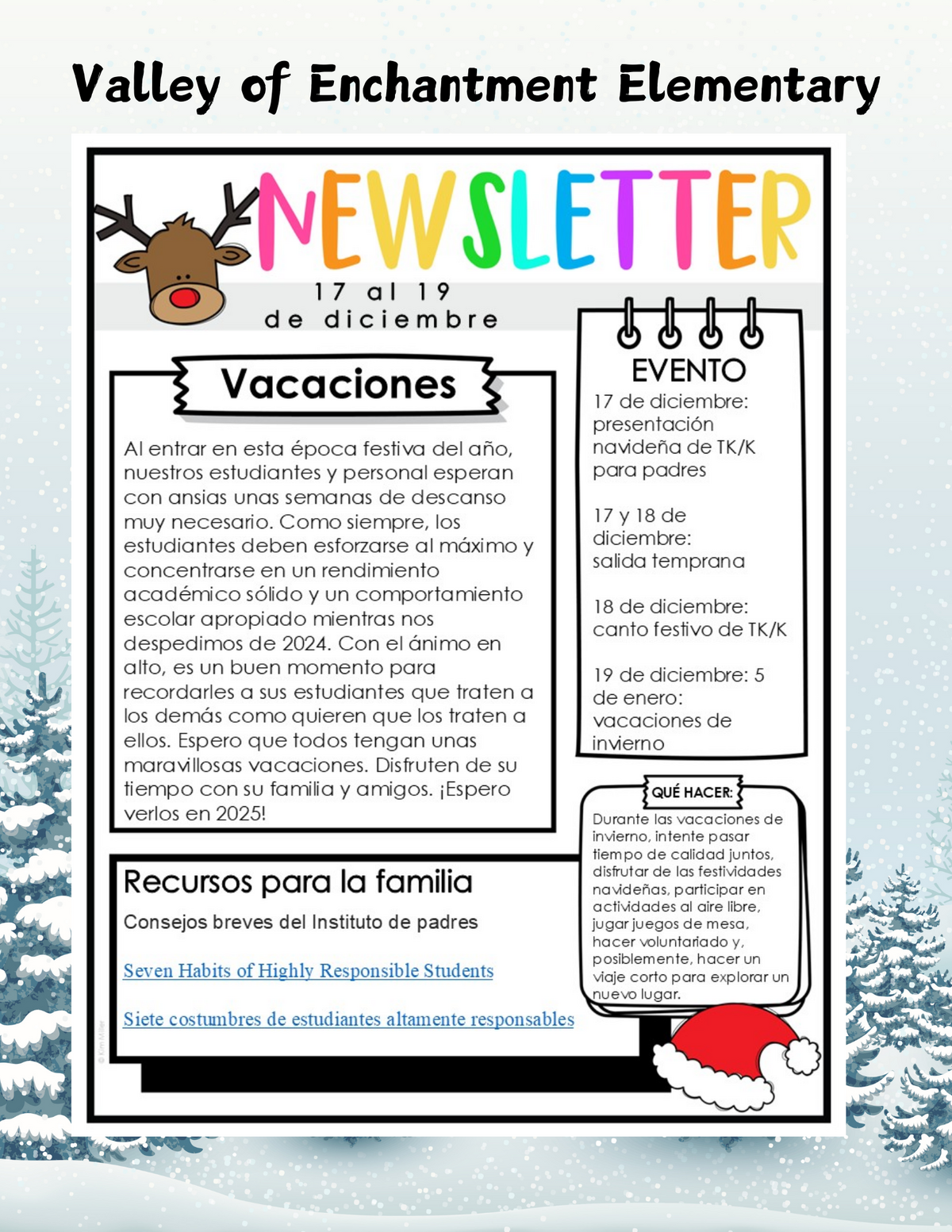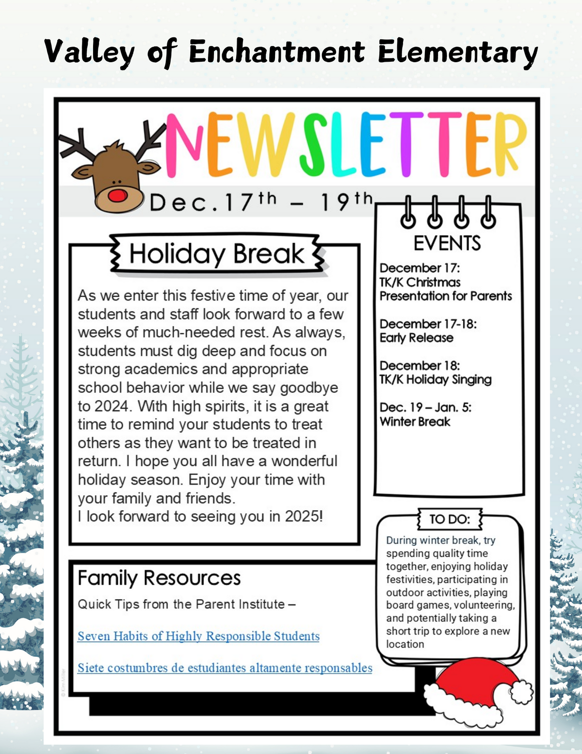 Page Five & Six, Seven: VOE: Holiday Break: As we enter this festive time of year, our students must dig deep and focus on strong academics and appropriate school behavior while we say goodbye to 2024. With high spirits, it is a great time to remind your students to treat others as they want to be treated in return. I hope you all have a wonderful holiday season. Enjoy your time with your family & friends. Â I look forward to seeing you in 2025. Dec. 17th-TK, K Christmas Presentation for Parents.; December 17th-18th- Early Release.; and December 19th to January 5th 2025-Winter Break. During winter break, try spending quality time together, enjoying holiday festivities, participating in outdoor activities, playing board games, volunteering, and potentially taking a short trip to explore a new location.Â