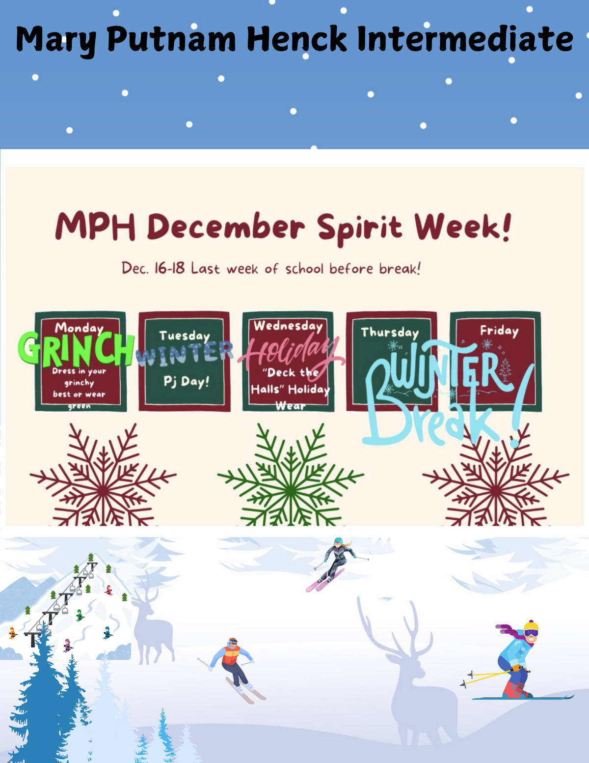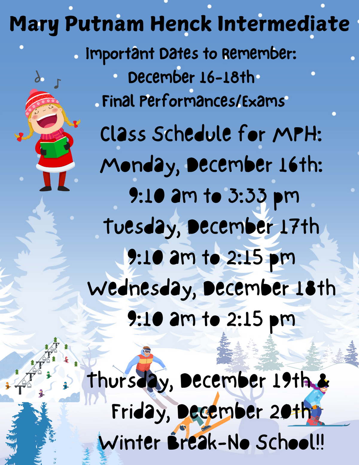 Page Ten & Eleven: Â Mary Putnam Henck Intermediate-Important Dates to Remember: December 16-18th Final Performances/Exams,; Class Schedule for MPH: Monday, December 16th: 9:10 am to 3:33 pm Tuesday, December 17th 9:10 am to 2:15 pm Wednesday, December 18th 9:10 am to 2:15 pm Thursday, December 19th & Friday, December 20th Winter Break-No School!!; MPH December Spirit Week! Dec 16th-18th. The last week of school before break! Monday-Grinch-Dress ub your grinchy best or wear green. Tuesday: Winter PJ Day.; Wednesday-Holiday-Deck the Halls Holiday Wear.; Winter Break-Thursday & Friday