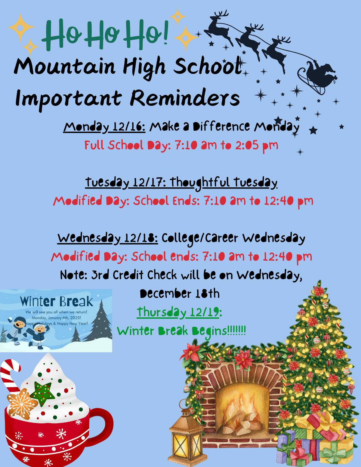 Page Twelve: Mountain High School Important Reminders-Monday 12/16: Make a Difference Monday Full School Day: 7:10 am to 2:05 pm Tuesday 12/17: Thoughtful Tuesday Modified Day: School Ends: 7:10 am to 12:40 pm Wednesday 12/18: College/Career Wednesday Modified Day: School ends: 7:10 am to 12:40 pm Note: 3rd Credit Check will be on Wednesday, December 18th Thursday 12/19: Winter Break Begins!!!!!!!