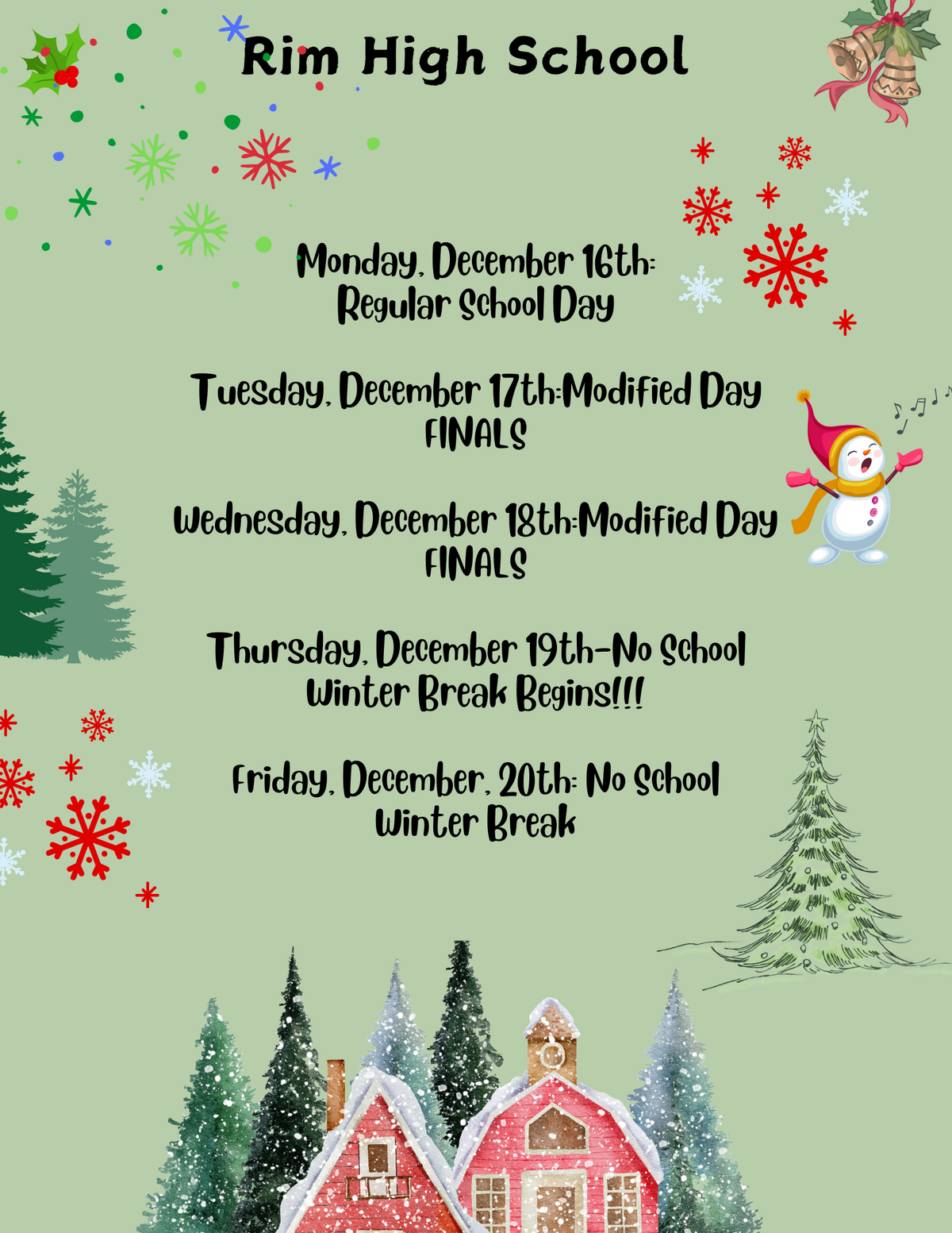 Page Thirteen: Rim High School: Monday, December 16th: Regular School Day Tuesday, December 17th:Modified Day FINALS Wednesday, December 18th:Modified Day FINALS Thursday, December 19th-No School Winter Break Begins!!! Friday, December, 20th: No School Winter Break