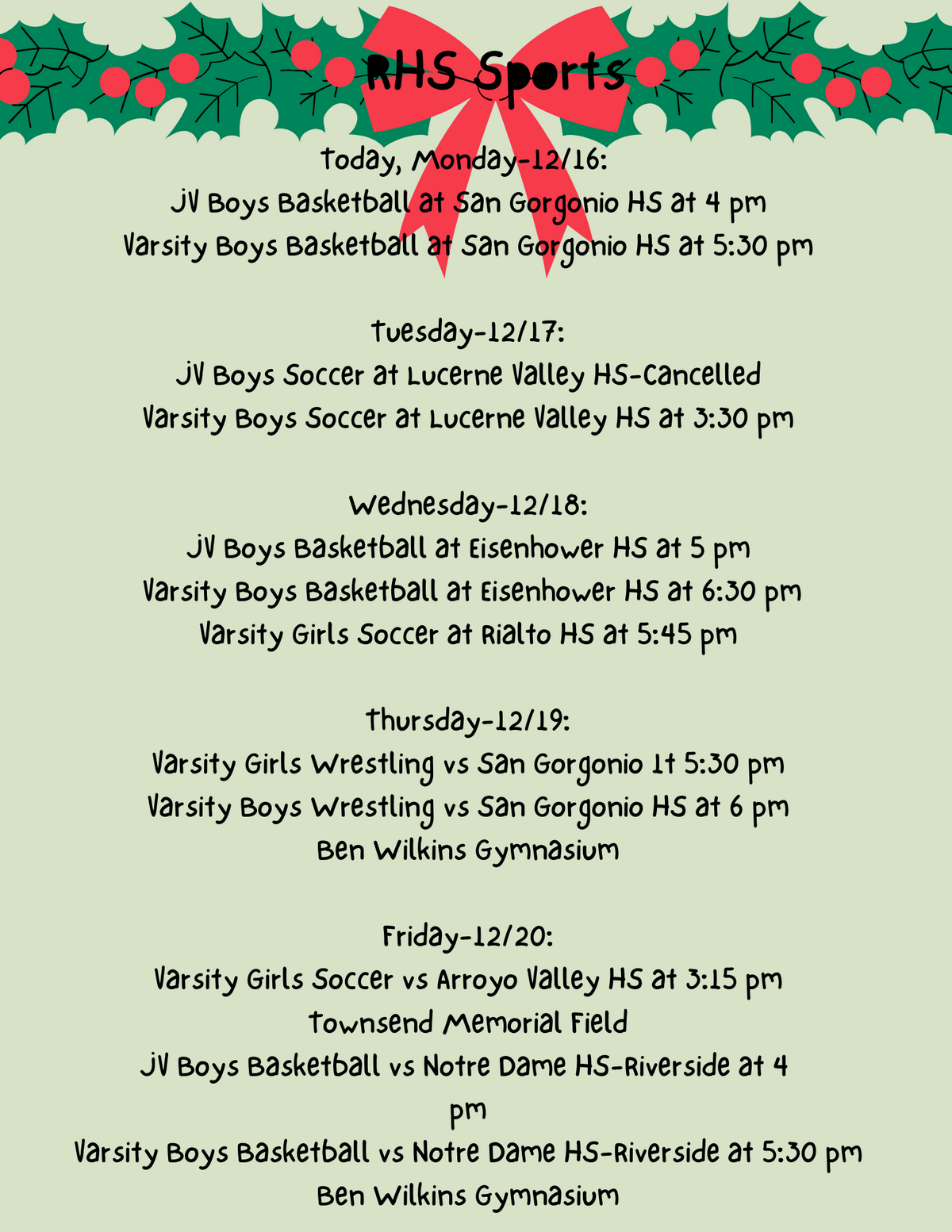 Page Fifteen:Â RHS Sports:Â Today, Monday-12/16: JV Boys Basketball at San Gorgonio HS at 4 pm Varsity Boys Basketball at San Gorgonio HS at 5:30 pm Tuesday-12/17: JV Boys Soccer at Lucerne Valley HS-Cancelled Varsity Boys Soccer at Lucerne Valley HS at 3:30 pm Wednesday-12/18: JV Boys Basketball at Eisenhower HS at 5 pm Varsity Boys Basketball at Eisenhower HS at 6:30 pm Varsity Girls Soccer at Rialto HS at 5:45 pm Thursday-12/19: Varsity Girls Wrestling vs San Gorgonio 1t 5:30 pm Varsity Boys Wrestling vs San Gorgonio HS at 6 pm Ben Wilkins Gymnasium Friday-12/20: Varsity Girls Soccer vs Arroyo Valley HS at 3:15 pm Townsend Memorial Field JV Boys Basketball vs Notre Dame HS-Riverside at 4 pm Varsity Boys Basketball vs Notre Dame HS-Riverside at 5:30 pm Ben Wilkins Gymnasium