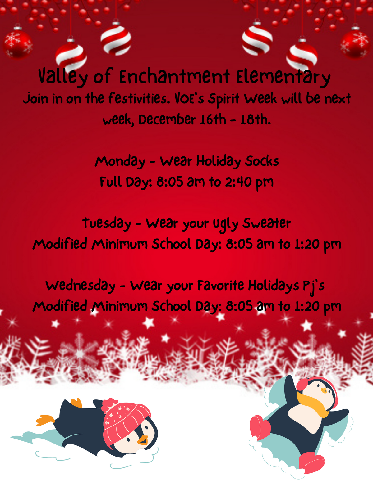Valley of Enchantment Elementary: Join in on the festivities. VOE's Spirit Week will be next week, December 16th - 18th. Monday - Wear Holiday Socks Full Day: 8:05 am to 2:40 pm Tuesday - Wear your Ugly Sweater Modified Minimum School Day: 8:05 am to 1:20 pm Wednesday - Wear your Favorite Holidays Pj's Modified Minimum School Day: 8:05 am to 1:20 pm