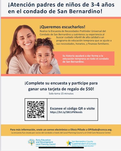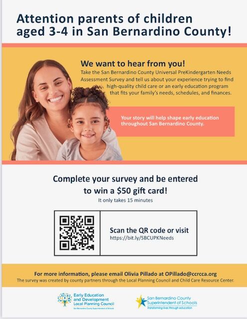 Are you a parent currently living in San Bernardino County with a 3- or 4-year-old child? We want to hear from you! Complete a 15-minute survey today and share your experiences trying to find high-quality child care and/or preschool that fits your family’s needs, schedule, and finances. Responses from this important survey will help shape early education and school readiness programs across our County. That means your stories will influence early care and education for the better! Bonus: All participants will be entered in a drawing to win a $50 gift card, and the survey will close on Friday, January 31st. Click here or visit https://bit.ly/SBCUPKNeeds to participate!